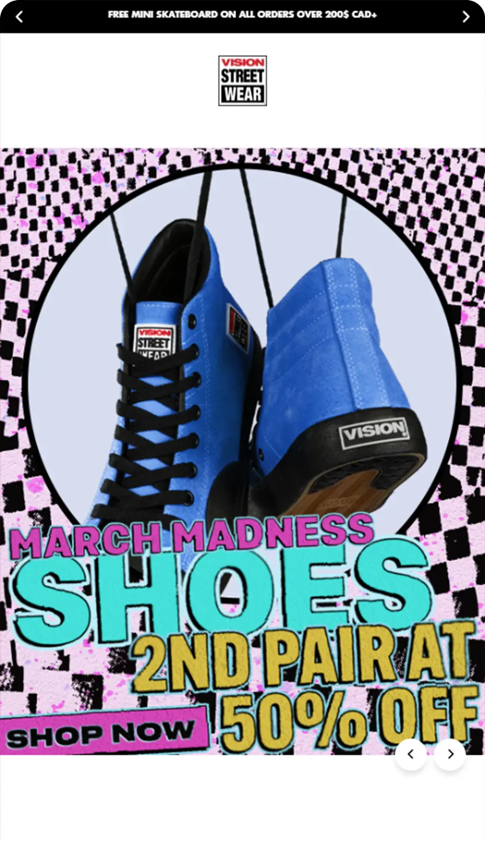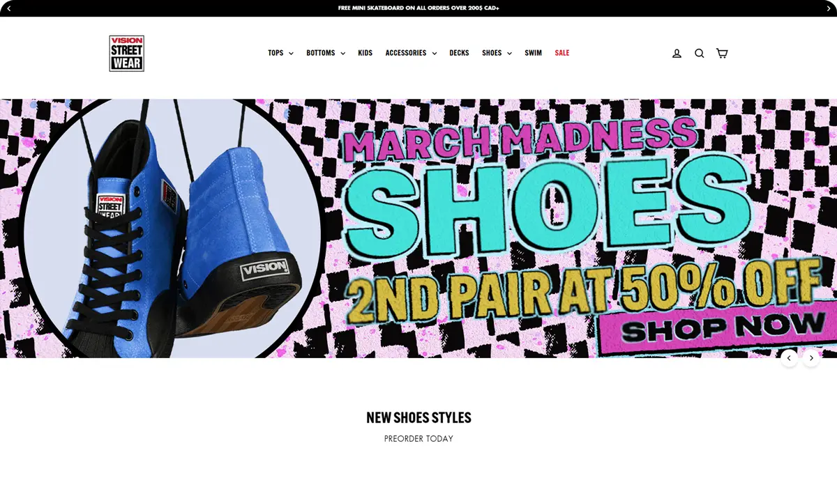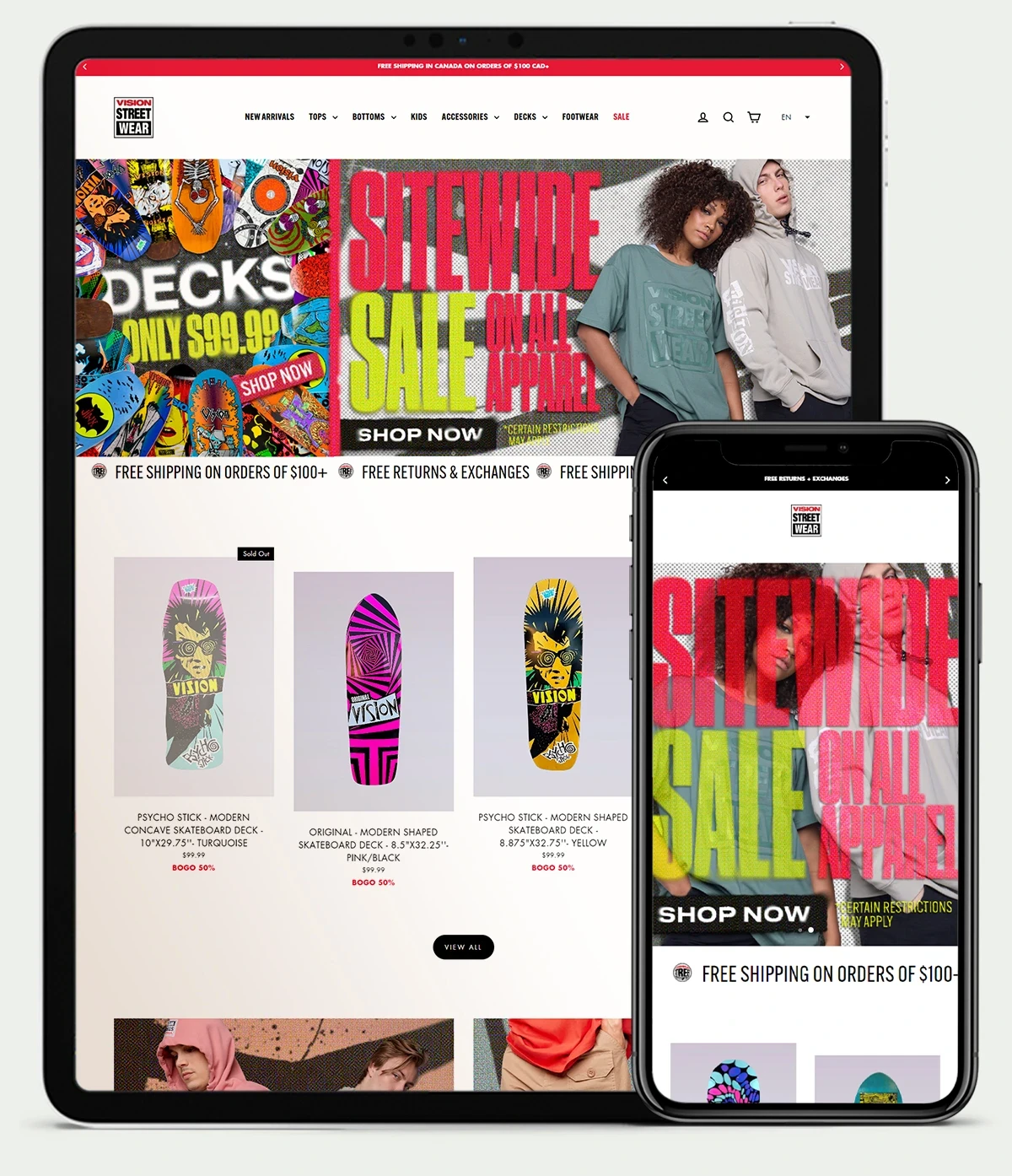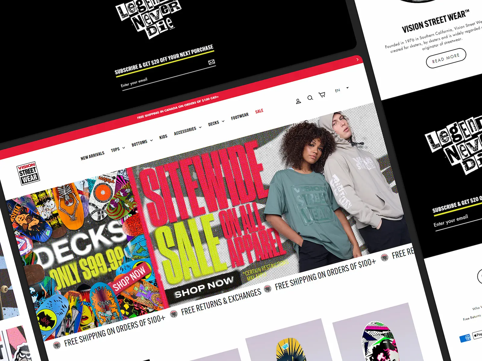The mandate was to redesign Vision Street Wear’s e-commerce, blending bold aesthetics with seamless functionality. From UX strategy to front-end development, we crafted a site that honors the brand’s heritage while optimizing for modern retail. Built on Shopify with custom HTML & CSS, the design delivers an intuitive shopping experience merging street style with performance.